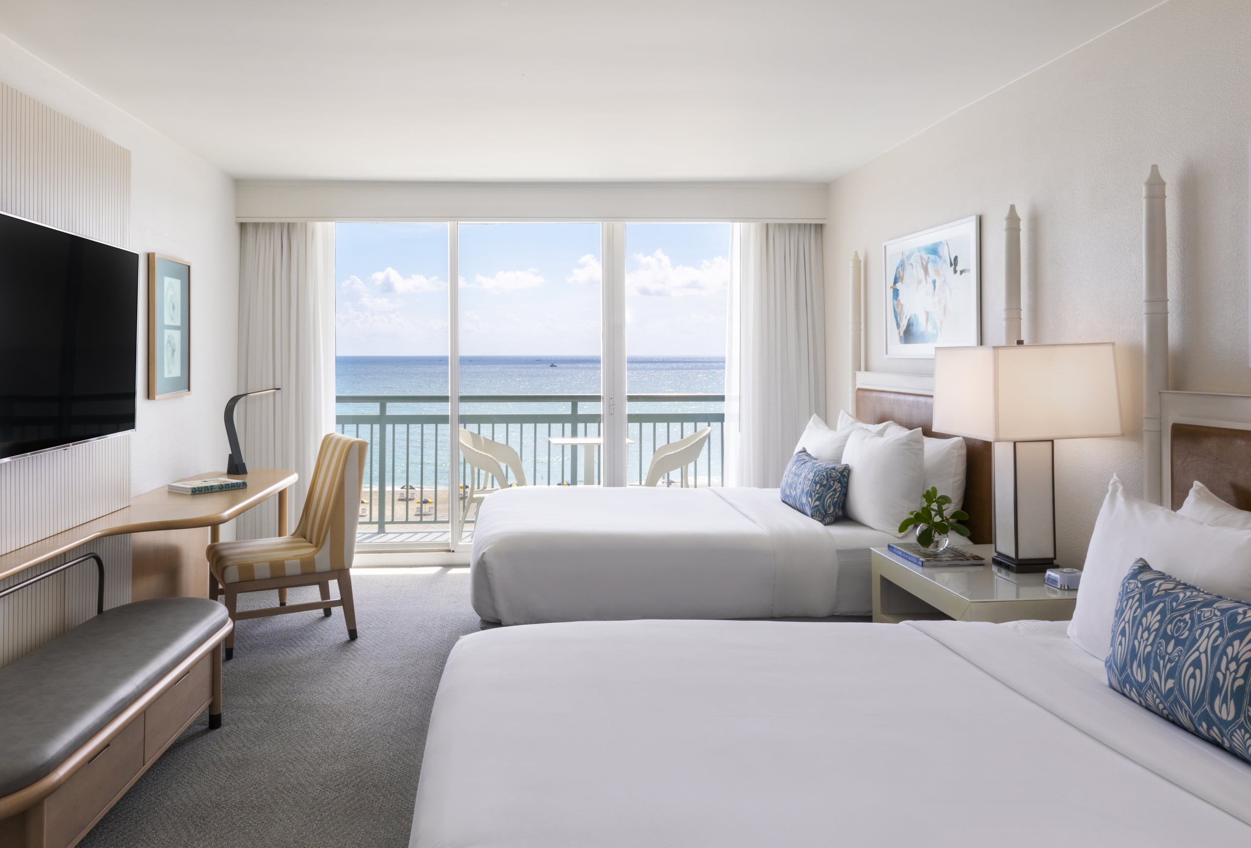 Choose from standard, oceanview, and oceanfront configurations in this classic seaside retreat. Two queen-sized serenity beds create an oasis of comfort and relaxation, complete with luxe Egyptian cotton linens. Floor-to-ceiling windows bathe the space in natural light, while thoughtful amenities like a generously sized work desk, in-room mini-fridge, and private balcony ensure you have everything you need for a seamless Singer Island experience.